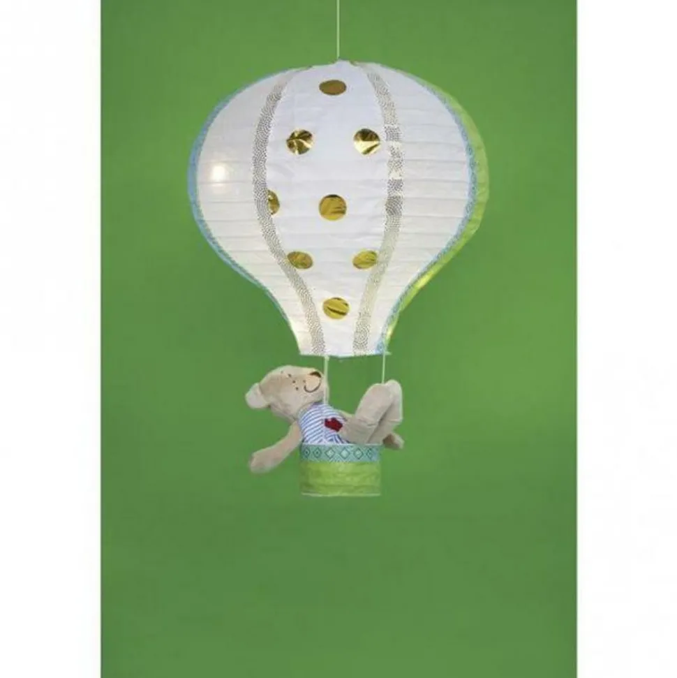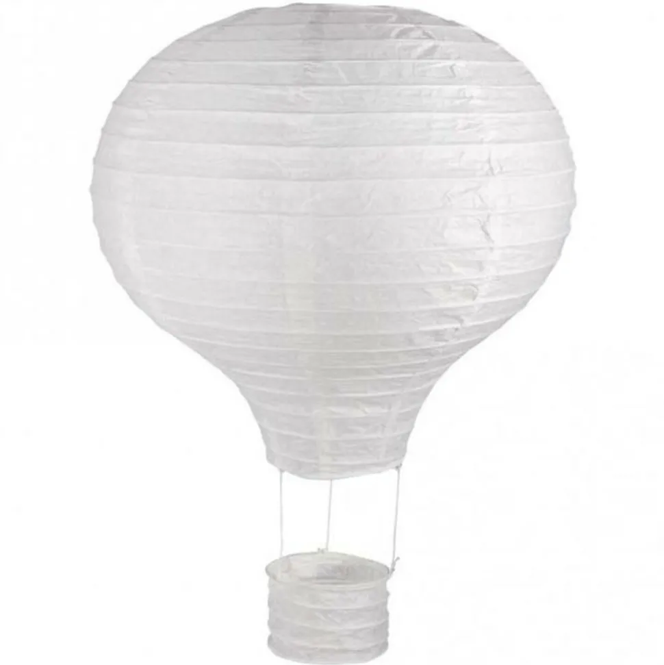 Lampe de papier en forme de montgolfière. Dimensions : Ø 30 cm x 40 cm Lampe en papier en forme de montgolfière avec son panier, idéale pour décorer la chambre du plus petit de la maison. Il peut être décoré avec du découpage, de la peinture, etc.