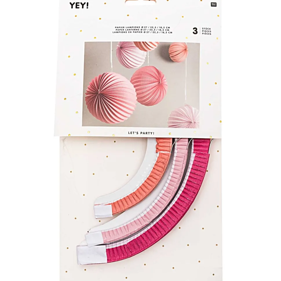 Composez votre décoration festive avec ces guirlandes lampions en papier rose. Fermeture et ouverture « scratch » faciles. Diamètre 27 cm, 22,5 cm et 18,5 cm. Contenu : 3 pièces de taille différentes.