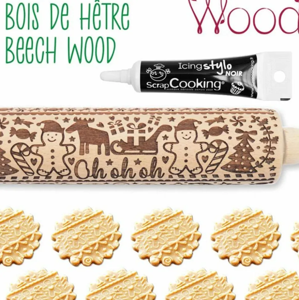 Ce rouleau en bois donnera du relief à vos biscuits sur le thème bonomme en pain d’épice. Grâce à sa gravure, le motif s’imprimera parfaitement dans la pâte et reste après cuisson. Pour la recette c’est à vous de jouer ! Laissez libre cours à vos envies et à votre imagination !. Ingrédients préparation sucrée gélifiée noire : sirop de glucose (45%), saccharose (40%), eau, agent gélifiant : E406, colorant : E153, arôme, acidifiant : E330, conservateur : E202.