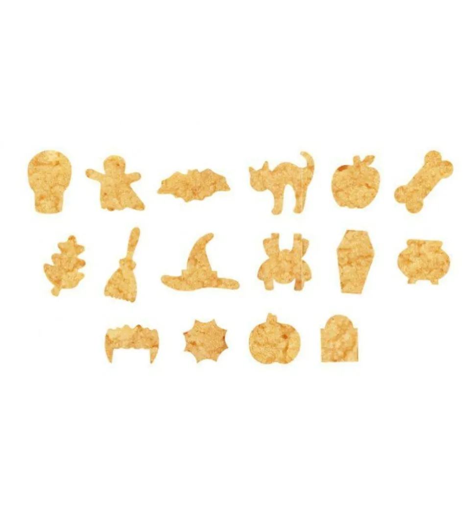 Boîte de 16 emportes-pièces pour biscuits d’Halloween et un stylo de glaçage noir 16 emportes pièces pour fabriquer des biscuits effrayants pour Halloween. La boîte contient 16 emportes-pièces : tête de mort, fantôme, chauve-souris, chat, pomme, os, feuille, balais, chapeau de sorcière, araignée, cercueil, chaudron, dents de vampire, toile d’araignée, citrouille et pierre tombale. Une fois vos biscuits cuits, décorez-les avec votre stylo de glaçage noir pour les rendre plus réalistes! Les emportes-pièces sont en fer blanc et aptes au contact alimentaire. En moyenne, ils mesurent +/- 3 cm x 6 cm x 2 cm à 8,5 cm x 10 cm x 2 cm.