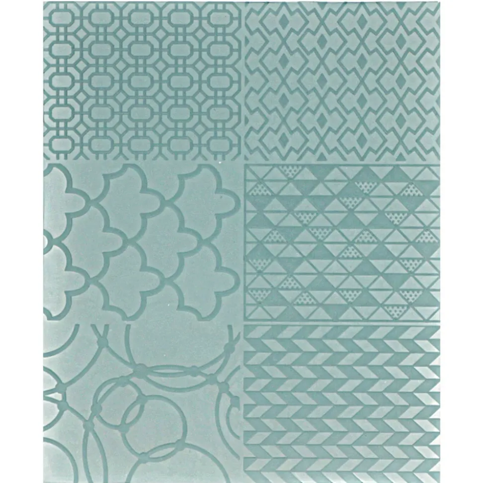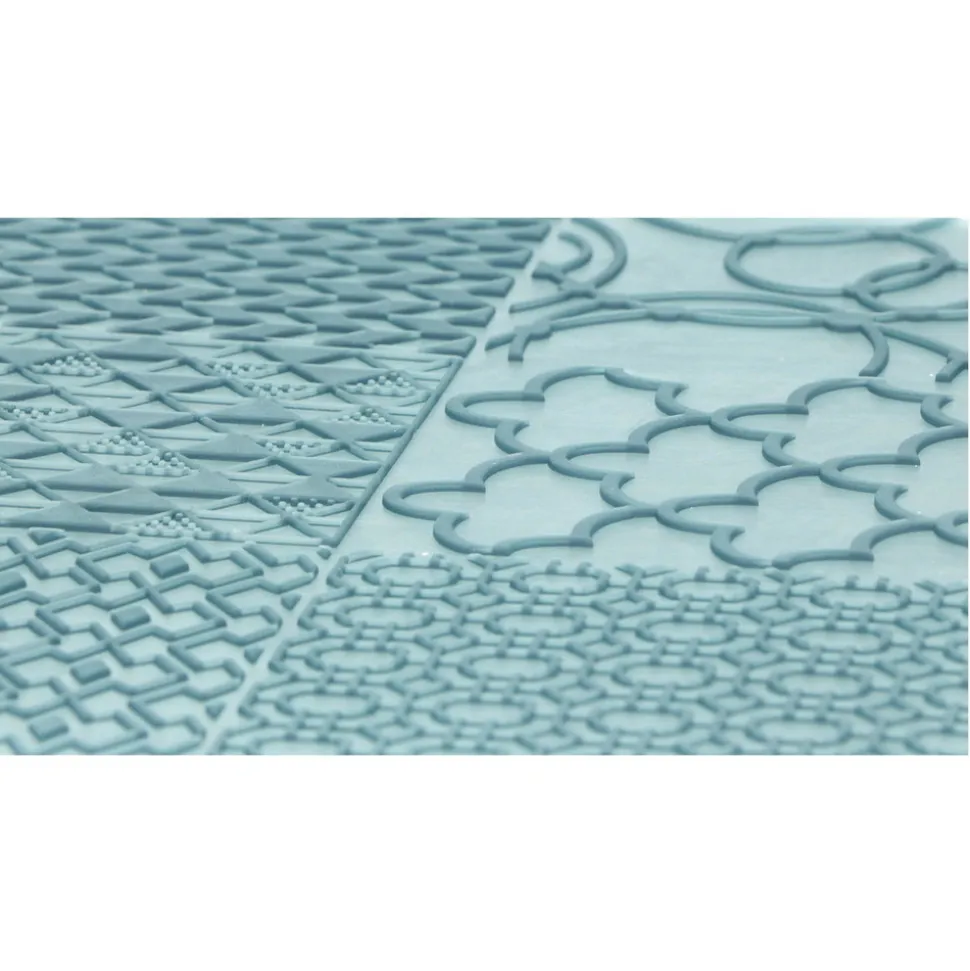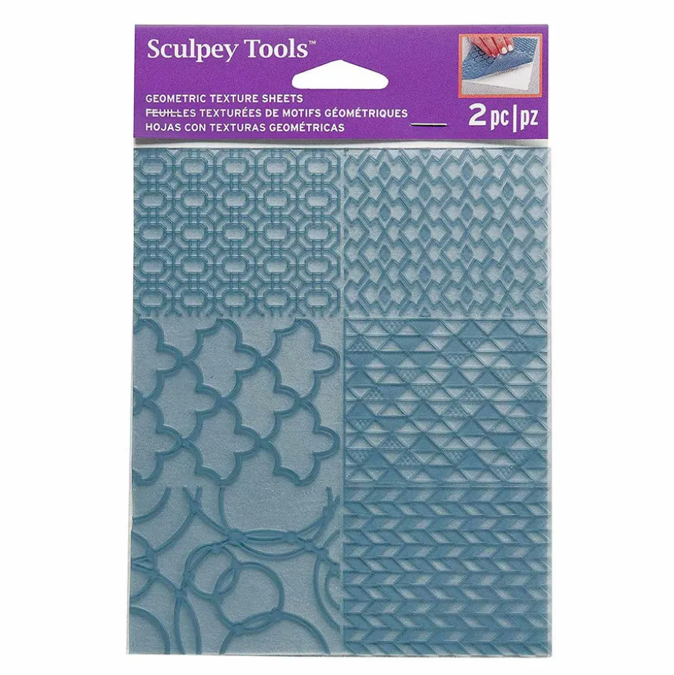 2 feuilles souples de texture sur le thème géométrique, idéales pour créer des motifs en relief. Ce produit contient 7 motifs : 1 feuille avec un grand motif de 14 x17 cm et 1 feuille avec 6 petits motifs rétro de 7 x 5,5 cm (chevrons, cercles, triangles, nuages, losanges et ovales). Ces feuilles texturées permettent d’intégrer des éléments décoratifs multidimensionnels à vos créations en argile. Vous pouvez répéter les motifs sur une grande surface car ils sont placés au bord de la feuille. Ces feuilles peuvent sont parfaitement dimensionnés pour être utilisées avec une machine à pâtes. Vous pouvez aussi tamponner pour décorer vos réalisations. Leur couleur transparente vous permet de voir facilement où vous souhaitez placer la texture. Se nettoient à l’eau et au savon.
