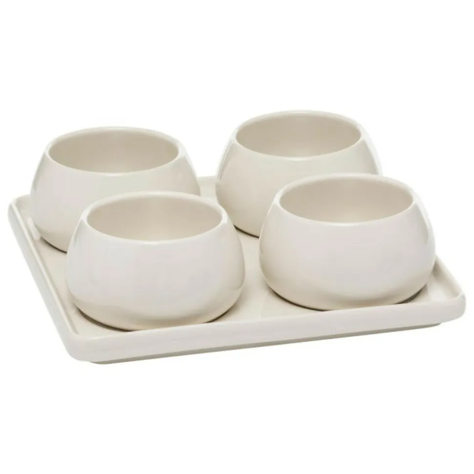 Dimensions : D. 21 x H. 6,8 cmMatière : GrèsSpécificités :Élégant & UtileService apéritif 5 piècesCompatible lave-vaisselle et micro-ondesContient :4 x ramequins ronds1 x plateau carréPoids : 1,34 kgCouleur : Blanc