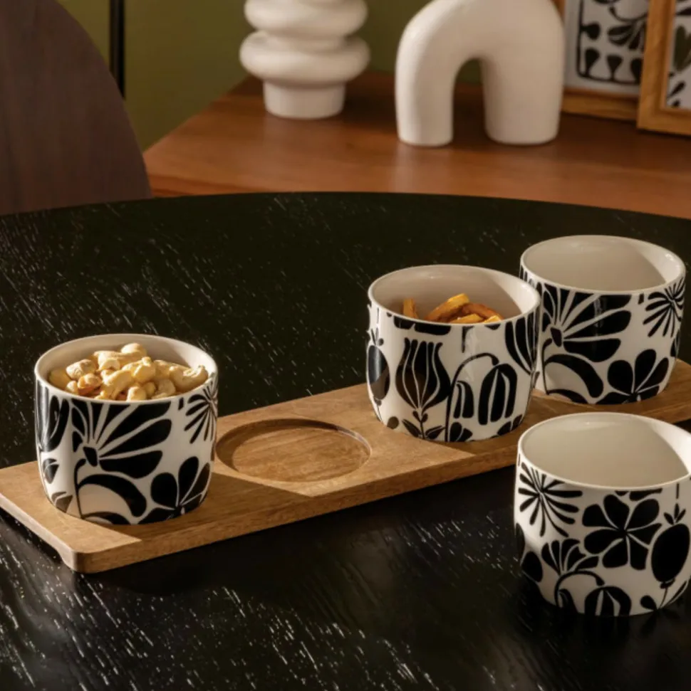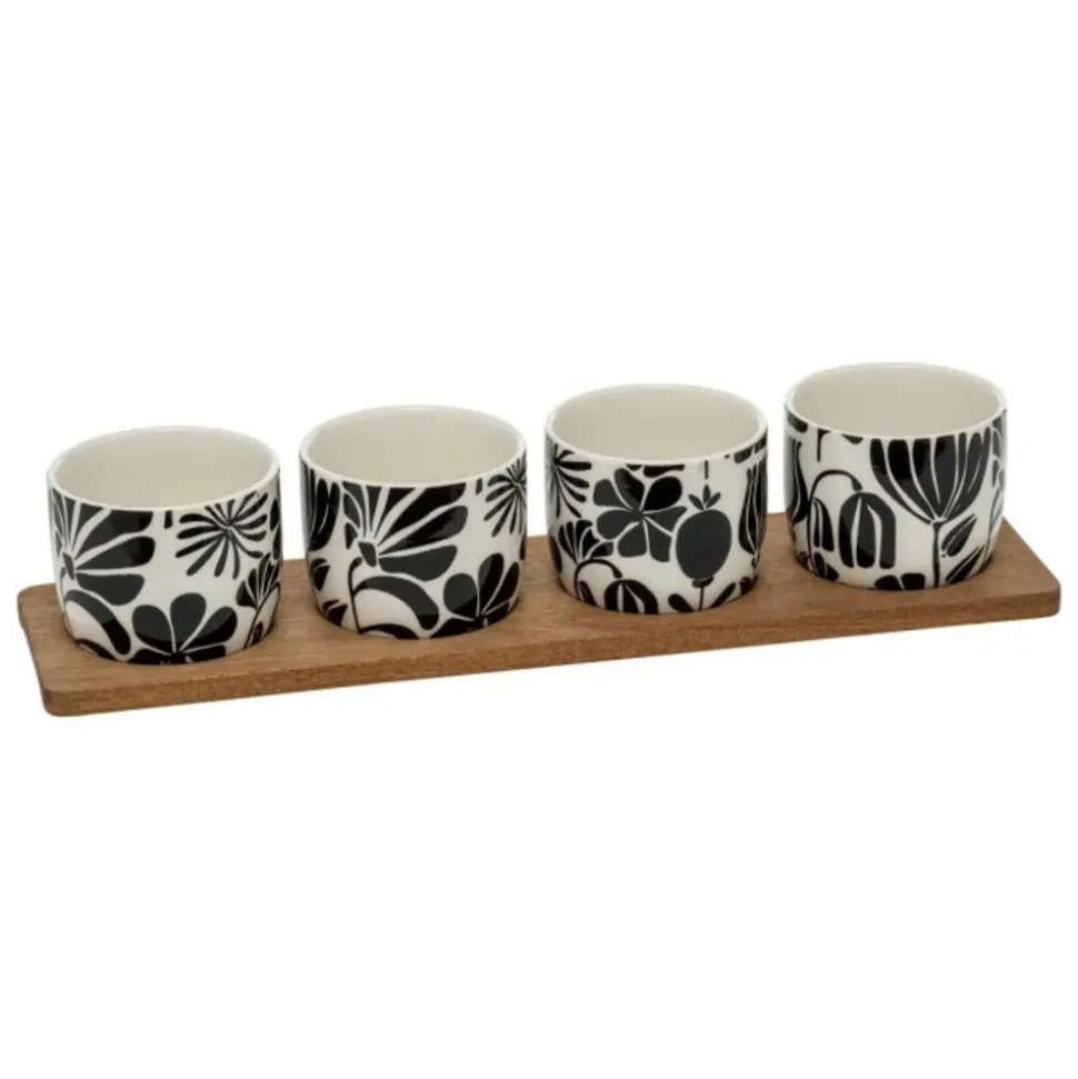 Dimensions : L. 41 x l. 11 x H. 1,2 cmRamequin : D. 9 x H. 7 cmMatières : Grès & Bois (Acacia)Spécificités :Pratique & UtileService apéritif 5 piècesImprimé floralContient :4 x ramequins1 x plateauPoids : 1,03 kg (à l’unité)Couleur : Noir & Blanc