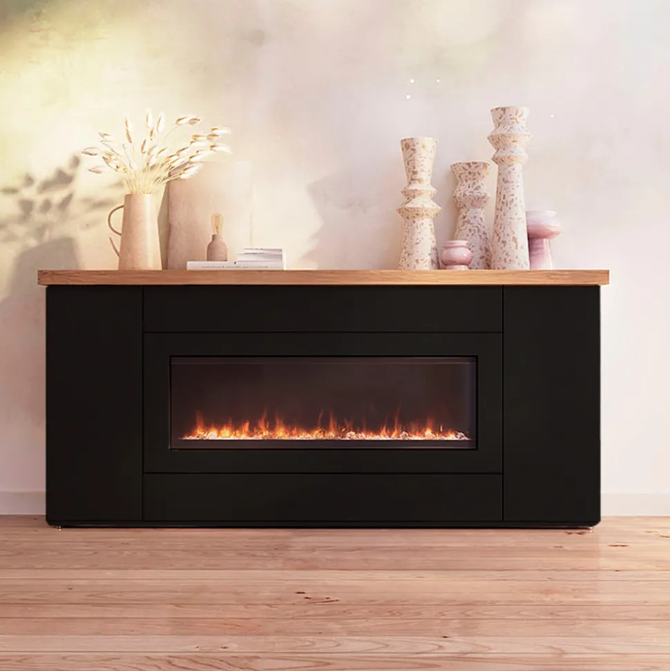 Insert électrique ISPICA : La cheminée électrique ISPICA avec télécommande s’intègre parfaitement dans le meuble noir avec cheminée intégrée, offrant un effet de flamme LED ultra réaliste, créant une atmosphère chaleureuse et cosy.