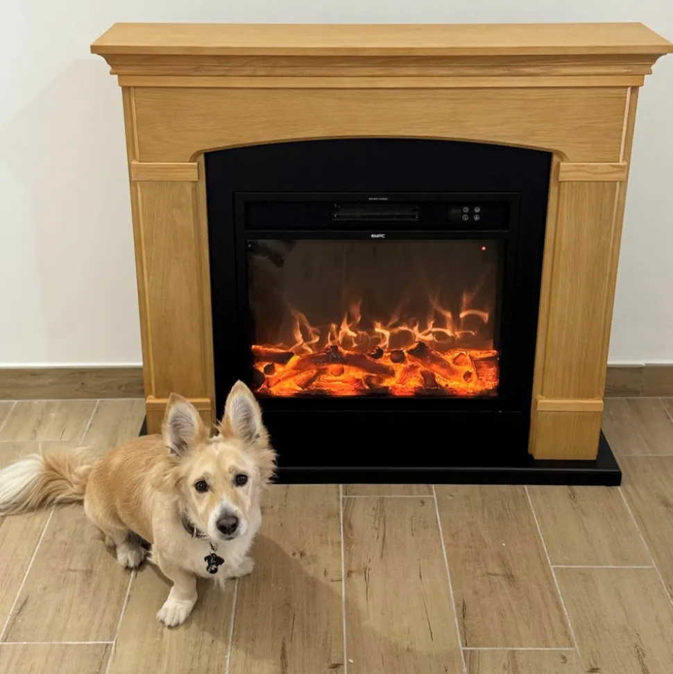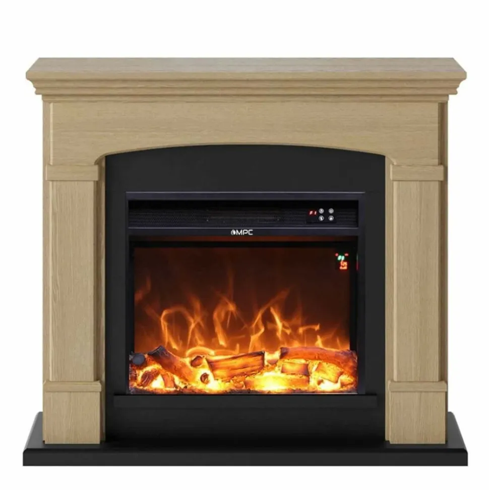 Cheminée au sol dans la nouvelle couleur chêne naturel, design épuré avec des bords arrondis. La cheminée présente une finition en chêne multicouche, ainsi qu’un centre arqué délicat, des colonnes lisses et un cadre central aux bords arrondis. La lumière LED intégrée est très réaliste. Sa profondeur de seulement 25 cm lui permet d’être peu encombrant et de s’adapter à toutes les pièces.