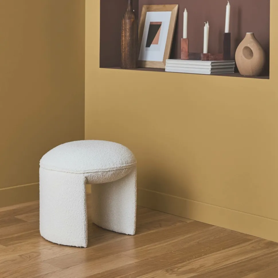 Les + produitsRevêtement boucletteTissu douxBois d’eucalyptusExplorez ce pouf, aussi moelleux qu’ergonomique. Son tissu bouclette vous enveloppe de confort, vous invitant à savourer chaque instant en sa compagnie. Employez-le comme siège d’appoint ou comme assise complémentaire. Que ce soit dans une entrée, une chambre ou même un salon, il se fond harmonieusement partout, ajoutant une note de design et de chaleur à votre espace intérieur de par sa simple présence.Sa structure, composée de bois d’eucalyptus et de contreplaqué, assure une robustesse essentielle à son utilisation optimale. Imaginez-le comme le petit détail bien pensé qui vient parfaire votre décor avec style.DimensionsPouf : L 44 x P 44 x H 42cmHauteur d’assise : 42cmPoids net : 4kgPoids max supporté : 110kg