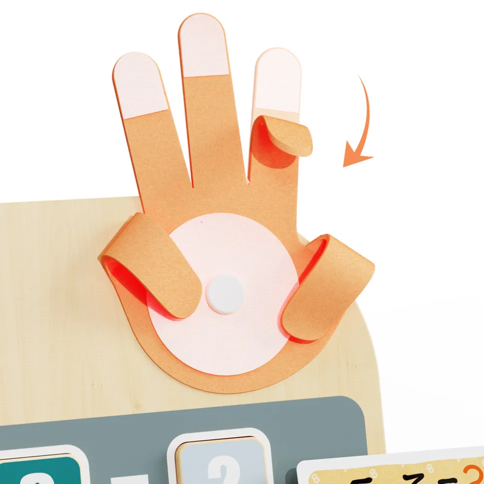 Deux mains colorées en feutrine aident les enfants à résoudre leurs premières additions et soustractions. Les doigts se fixent au milieu de la main à l’aide de bandes velcro. Les enfants bougent les doigts à leur guise et calculent les résultats corrects tout en s’amusant !