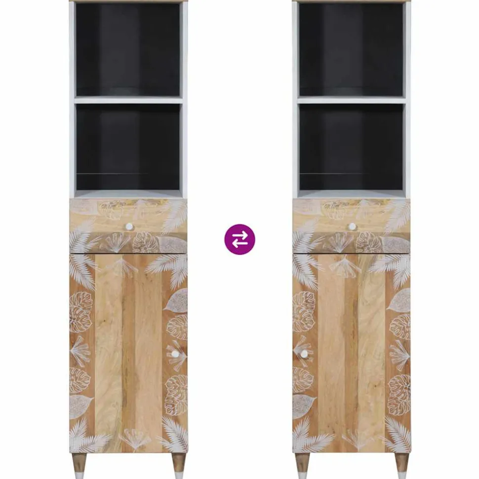 Cette armoire de salle de bain est un excellent choix pour votre salle de bain, la rendant bien rangée et organisée ! Matériau robuste et stable : le bois de manguier massif, un bois dur tropical robuste, est très apprécié pour la fabrication de meubles en raison de sa durabilité et de sa solidité exceptionnelles. Ses beaux grains de bois rendent chaque meuble unique et légèrement différent de l’autre.Grand espace de rangement : l’armoire de rangement de salle de bain offre suffisamment d’espace pour ranger facilement vos articles de toilette et articles de bain essentiels tels que savons, shampoing, dentifrice, etc.Pieds en bois : les pieds en bois donnent aux meubles de salle de bain un aspect naturel et agréable tout en assurant la stabilité. Il peut bien s’intégrer dans n’importe quel décor d’intérieur.Aspect attrayant : le design remarquable du placard de salle de bains rehausse l’aspect général de votre espace grâce à ses lignes douces et à ses motifs sophistiqués, ce qui en fait le point fort de n’importe quelle pièce. Bon à savoir :Chaque article est unique, avec des variations de couleurs et de grains. La livraison est aléatoire, ce qui garantit l’exclusivité et l’individualité de votre produit. Attention :Pour éviter qu’il ne bascule, ce produit doit être utilisé avec le dispositif de fixation murale fourni.