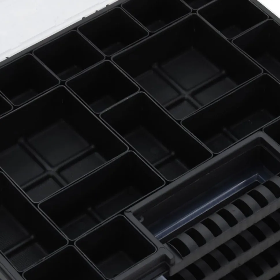Cet ensemble de boîtes d’assortiment pratique, comprenant des séparateurs réglables, est une excellente aide dans votre garage, votre atelier et des endroits similaires ! Couvercle transparent : le couvercle transparent offre une vue du contenu intérieur. Ainsi, vous pouvez facilement reconnaître et trouver des boulons, des écrous, des clous et d’autres petites pièces.Séparateurs réglables : la boîte assortie, comprenant des séparateurs réglables, peut être divisée en plusieurs compartiments, ce qui garantit que tout se trouve à sa place.Large application : cet organisateur d’outils pratique est certainement un excellent choix pour les personnes qui apprécient la propreté et l’ordre pendant le bricolage et l’artisanat et même pour les professionnels au lieu de travail.