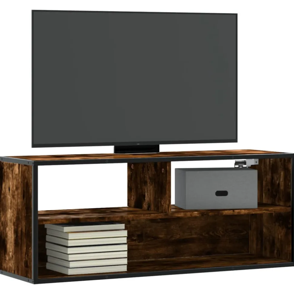Avec un design à la fois tendance et pratique, ce meuble TV robuste deviendra un point central de votre pièce. Cadre stable et durable : le cadre en métal du meuble TV rehausse votre intérieur d’un style industriel et offre une durabilité, une stabilité et une résistance à la corrosion exceptionnelles.Matériau stable et durable : le bois d’ingénierie est un matériau durable et stable dont la surface lisse résiste à l’humidité, à la déformation et au fendillement, ce qui en fait un choix fiable pour une grande variété de projets.Grand espace de rangement : le meuble TV offre un grand espace de rangement pour garder vos lecteurs DVD, récepteurs, disques et autres petits objets bien organisés et à portée de main.Fonction murale : ce meuble multimédia peut être fixé au mur, vous pouvez facilement l’accrocher au mur sans occuper d’espace au sol. Bon à savoir :Les vis et les chevilles pour l’intérieur du mur ne sont pas incluses. Nous vous conseillons de trouver et d’utiliser des vis et des chevilles adaptées spécifiquement à vos murs. Si vous n’êtes pas sûr, vous pouvez consulter un professionnel. Veuillez lire et suivre chaque étape des instructions.