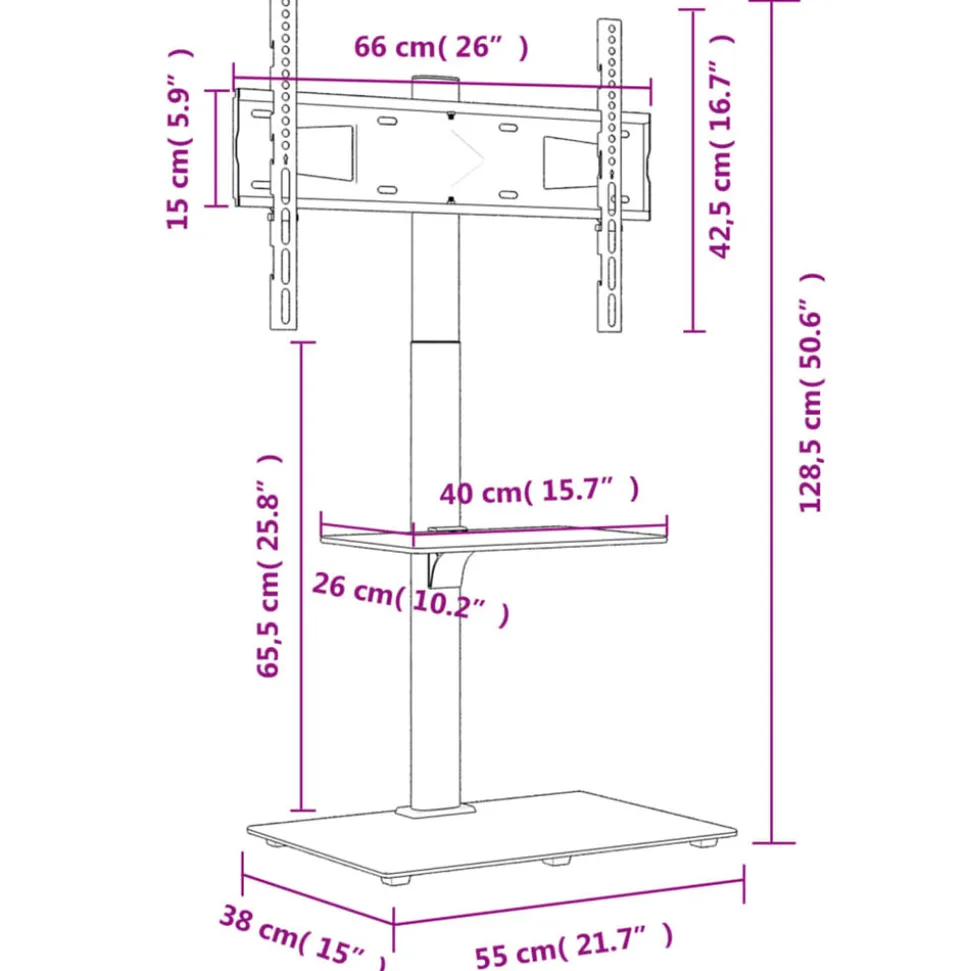 Ce meuble TV d’angle offre une solution pratique pour installer votre TV et ajouter un espace de rangement supplémentaire à votre pièce. Fonction de pivotement : ce support TV peut pivoter de 25° à gauche et à droite pour vous offrir un meilleur angle de vision.Grand espace de rangement : le meuble multimédia est conçu avec 2 étagères, ce qui offre un grand espace pour placer des DVD, des appareils multimédias et d’autres objets décoratifs dans la zone de charge.Peu encombrant : ce meuble TV de plancher est compact et ne prend pas beaucoup de place. Vous pouvez donc le placer dans le coin d’un petit salon, d’une chambre à coucher ou d’un bureau. De plus, il est doté d’un système de gestion des câbles qui permet de gagner de l’espace et de ranger les fils à l’arrière du meuble TV.Compatibilité VESA : ce meuble TV est compatible avec les formats VESA allant de 200 x 200 mm à 600 x 400 mm, tels que 600×400/400×400/400×300/400×200/200×400/300×300/300×200/200×200 mm. Bon à savoir :Assurez-vous que votre téléviseur possède quatre trous de fixation filetés à l’arrière de l’écran. Nous vous recommandons de mesurer l’espacement des trous VESA sur votre téléviseur avant l’achat pour garantir la compatibilité.Veillez à ce que la largeur de votre téléviseur corresponde au support TV et que la hauteur entre le support TV et la table en verre supérieure corresponde également à votre téléviseur.Nous fournissons différentes vis et entretoises pour s’adapter à votre téléviseur, mais elles peuvent ne pas fonctionner pour toutes les marques. Vous devrez peut-être utiliser les vis d’origine fournies avec votre téléviseur ou acheter des vis spéciales vous-même.Attention :Pour éviter qu’il ne bascule, ce produit doit être utilisé avec le dispositif de fixation murale fourni.