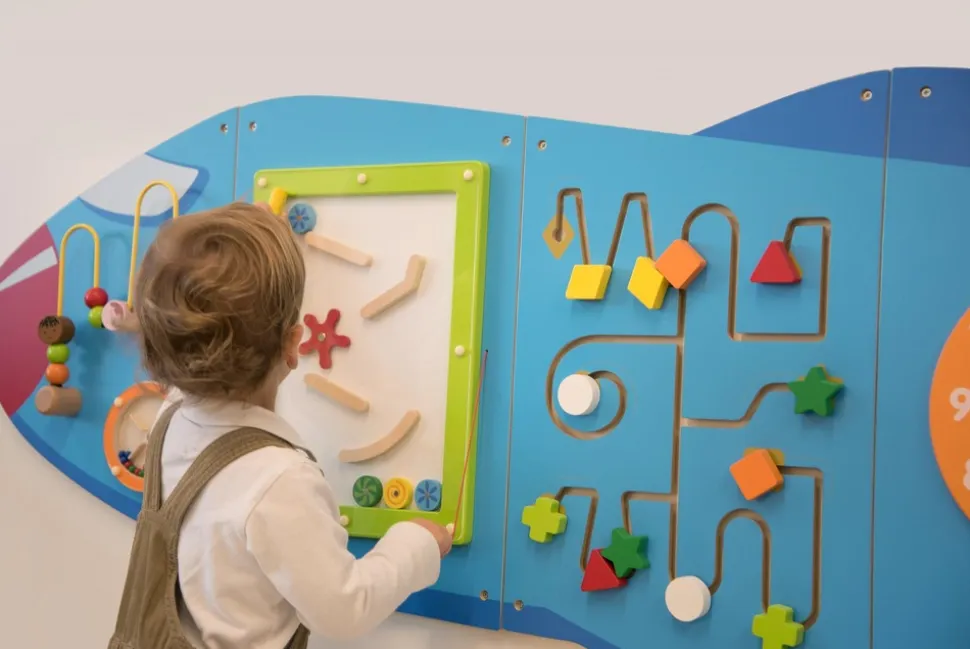 Ce jouet mural en forme d’avion propose différentes activités de motricité fine et d’éveil aux enfants, en les encourageant à jouer ensemble ou individuellement. Ce panneau d’activités mural se divise en 5 parties proposant chacune une activité : une horloge avec des aiguilles mobiles, un looping de perles, un jeu magnétique, un labyrinthe de formes et des engrenages rotatifs.