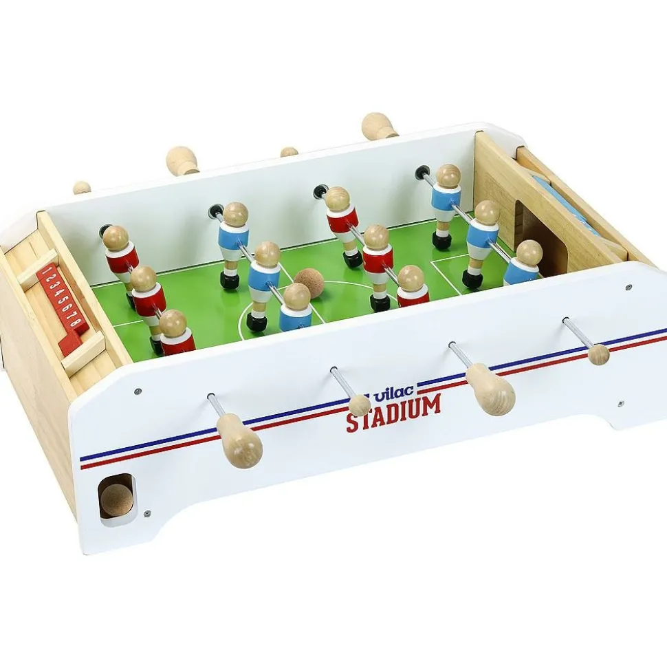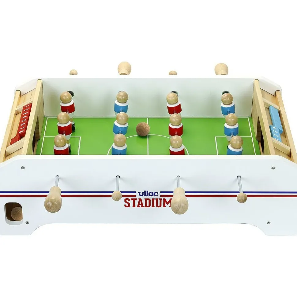 Le Babyfoot Vilac Stadium est un Babyfoot en bois de 12 joueurs et 3 balles en liège, avec un compteur de points pour chaque équipe.