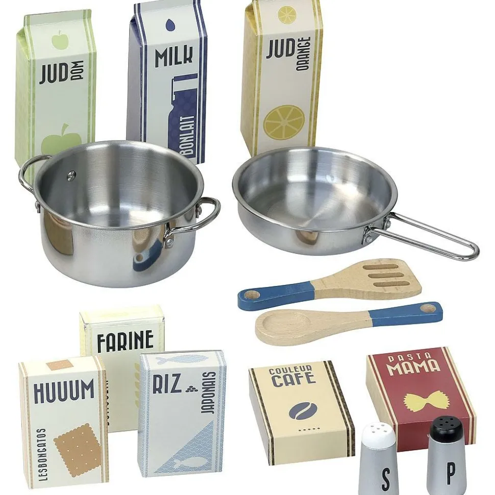 Les petits vont pouvoir préparer de bons petits plats pour leurs convives dès 3 ans grâce à cette cuisine en bois et ses accessoires : 1 salière et 1 poivrière sonores en bois, 1 spatule et 1 cuillère en bois, 1 faitout et 1 poelle en métal, 8 mini pack en carton.