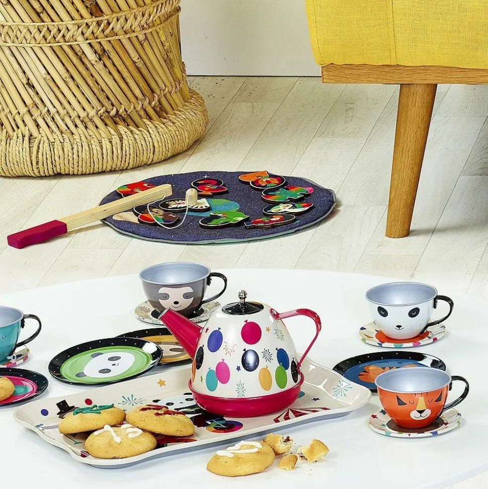Lorsqu’on penche la théière pour servir les petits invités, une jolie mélodie se déclenche « Joyeux anniversaire ». Une dinette originale inculant une théière musicale, 4 tasses, 4 sous-tasses, 4 assiettes à dessert, 1 plateau.