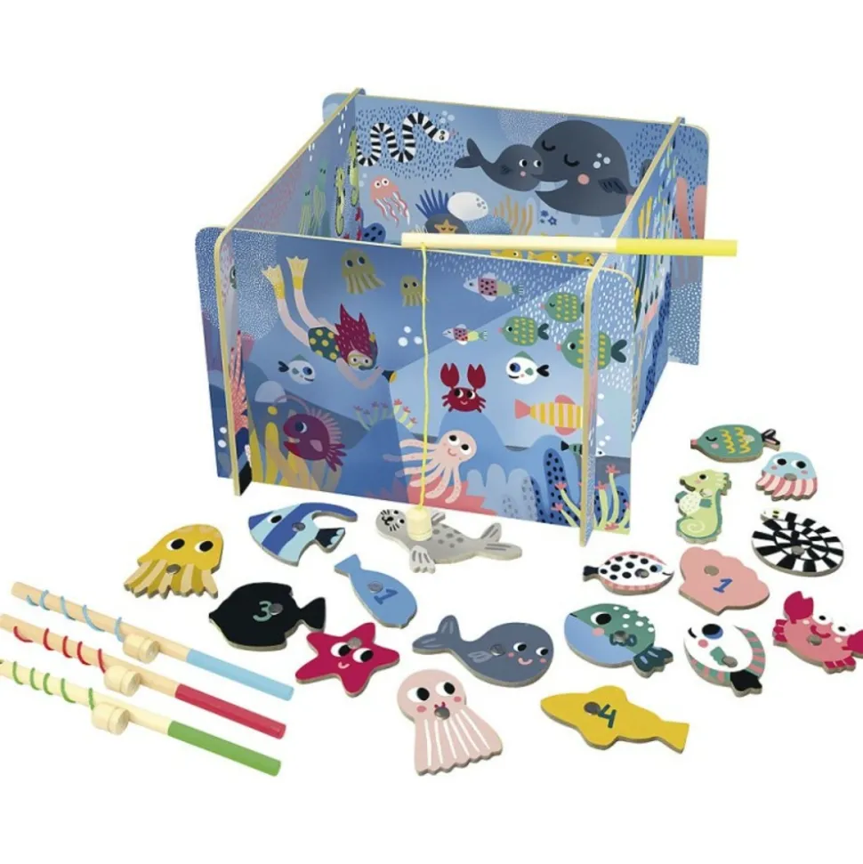 Ce jeu de pêche à la ligne magnétique contient 4 cannes à pêches en bois et 20 pièces aimantées à pêcher. A partir de 3 ans.