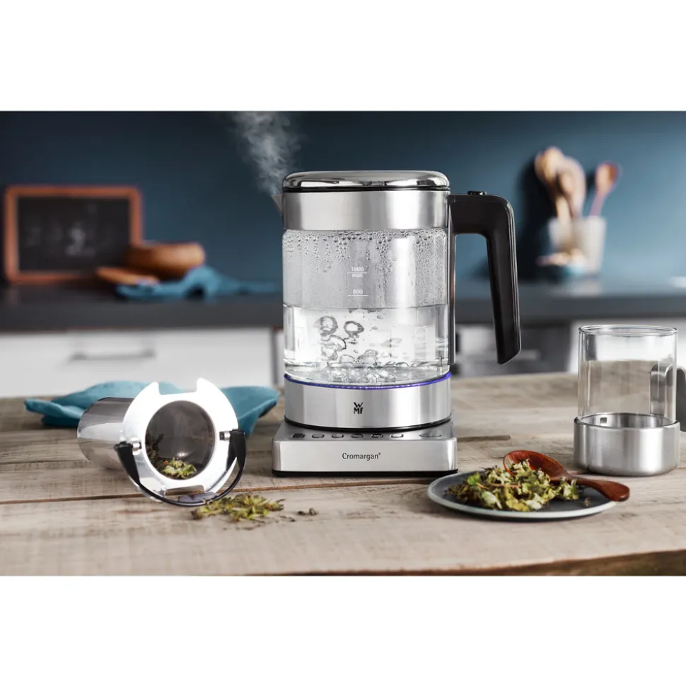 Bouilloire-théière 2en1 KITCHENminis Wmf 0413180012. Bouilloire verre compacte avec une fonction de préparation de thé. Adaptez la température d?eau chaude avec la nouvelle bouilloire en verre WMF KITCHENminis® Vario. 5 niveaux de température d?eau, plus une idéale pour la préparation du thé. Elle inclut un support de sachet de thé, et une passoire pour feuilles de thé. Vous aurez juste à remplir votre tasse et déguster. Fabriquée en verre résistant à la chaleur SCHOTT Duran, et d?une capacité d?1 litre, la bouilloire en verre Vario WMF KITCHENminis® est d?un faible encombrement pour les petites cuisines.Pensés pour les petits foyers, les KITCHENminis® WMF au design peu encombrant se caractérisent par leur fonctionnalité, leur utilisation pratique, et leurs performances exceptionnelles.Les points fortsBouilloire design composée de Cromargan® mat et de verre SCHOTT Duran.Elle est résistante à la chaleur, neutre en goût et facile à nettoyer, capacité 1 litre.5 niveaux de température : 60°C, 70°C, 80°C, 90°C, 100°C, avec un signal sonore.dès que la température désirée est atteinte , fonction maintien au chaud pendant 20 minutes.Support de sachet de thé intégré dans le couvercle.Couvercle facile à ouvrir, d?une simple pression.Filtre calcaire amovible, facile à nettoyer.