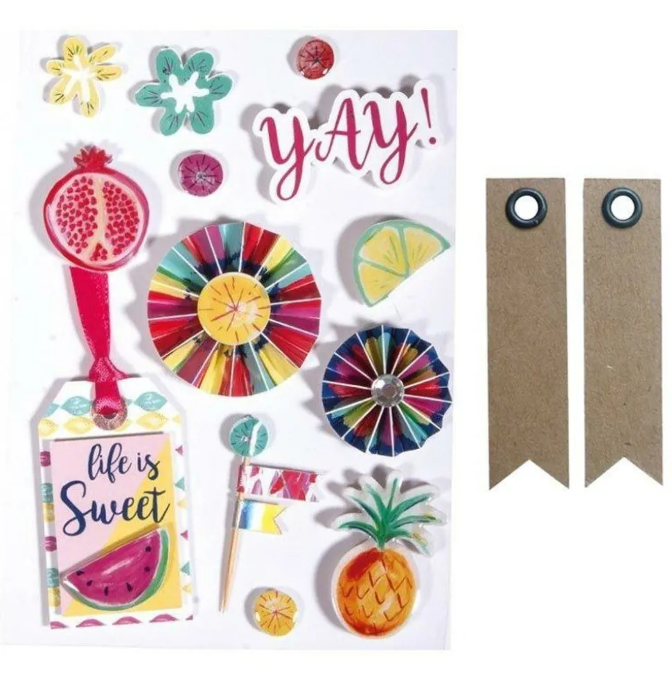 9 autocollants 3D représentant des fleurs, fruits, tags de la marque Rayher.Un autocollant mesure de 1 cm x 4.5 cm de largeur et de 1 cm à 6 cm de longueur (LxH).Ces autocollants multicolores vous permettent de personnaliser des pages de scrapbooking, des cartes, mais aussi de décorer des objets.Les autocollants sont très utilisés en scrapbooking et permettent de décorer vos projets facilement!Pas chers et pratiques, ils sont très diversifiés et apporteront de la fantaisie à vos créations.Pour les utiliser, il suffit de décoller le motif choisi de la planche et de le positionner à l’endroit souhaité sur votre création.20 étiquettes kraft en forme de fanion, dimension 5 x 1,2 cm.A utiliser pour le scrapbooking, la décoration d’intérieur, pour compléter le service de table d’un mariage.Ces étiquettes comprennent un trou avec un œillet marron foncé pour y faire passer une ficelle.