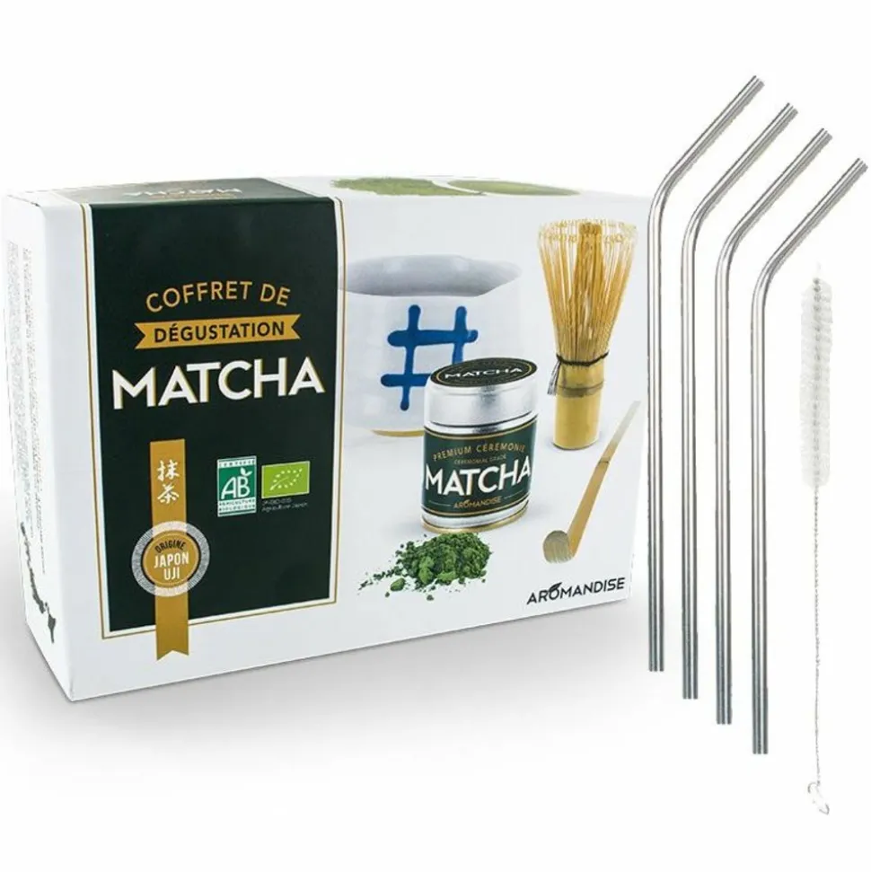Coffret de dégustation du thé Matcha à offrir pour les amateurs de thé Japonais ou pour ceux qui apprécient ou qui veulent découvrir le thé Matcha. Un coffret complet pour préparer un thé matcha de cérémonie d’une grande qualité! A l’intérieur de cette jolie boîte, vous trouverez 30 grammes de poudre de thé vert Matcha issu de l’agriculture biologique, un fouet Chasen en bambou de 100 brins, une cuillère à thé Matcha en bambou doré appelée Chashaku et un bol de cérémonie Chawan en céramique. Découvrez la poudre de thé matcha biologique, d’un vert tendre, à l’intense saveur de chlorophylle et au bon goût crémeux. fabriquée exclusivement à partir des feuilles de printemps de première récolte, de qualité Gyokuro, cette poudre de thé Matcha est cultivée dans le prestigieux terroir de Uji à Kyoto. Cette poudre de thé Matcha mousse très facilement au fouet de bambou Chasen. Les 4 pailles en acier inoxidable de 21 cm sont nettoyables facilement grâce à un goupillon de nettoyage avec une petite brosse. Elles permettent de préserver la nature et de ne pas jeter d’accessoires en papier ou en plastique.