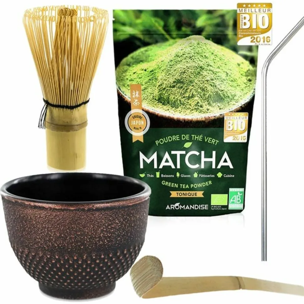 Adulé au Japon, le thé Matcha y fait partie de la vie quotidienne. Fabriqué à partir des jeunes pousses de thé, les feuilles sont ensuite cuites à la vapeur, séchées et moulues jusqu’à obtenir une poudre bien lisse. Au japon, le thé vert matcha stimule l’esprit en étant traditionnellement battu au fouet lors de la cérémonie du thé, appelée chanoyou. Dans une tasse en fonte 80 ml noire & violette, issue de l’artisanat traditionnel de la province du Guandong, en Chine, dosez environ 1 gramme de thé en poudre pour 100 ml d’eau chaude grâce à la cuillère en bambou (longueur 16 cm). Il faut recouvrir votre poudre de thé matcha d’une eau tiède, mais pas bouillante (70°C environ). Ensuite, avec le petit fouet à Matcha Chasen 100 brins de bambou fabriqué à partir d’une seule pièce de bambou doré à Zhejiang, en Chine, fouettez en zigzags jusqu’à ce que de la mousse apparaisse, pour le déguster ensuite. Au quotidien, une eau un peu plus chaude conviendra et vous pourrez déguster votre thé japonais matcha bio juste après avoir mélangé. Il est recommandé d’utiliser. NB : le fouet et la cuillère se rincent à l’eau claire sans détergent. Pas de lave-vaisselle. Les 4 pailles en acier inoxidable de 21 cm sont nettoyables facilement grâce à un goupillon de nettoyage avec une petite brosse. Elles permettent de préserver la nature et de ne pas jeter d’accessoires en papier ou en plastique.