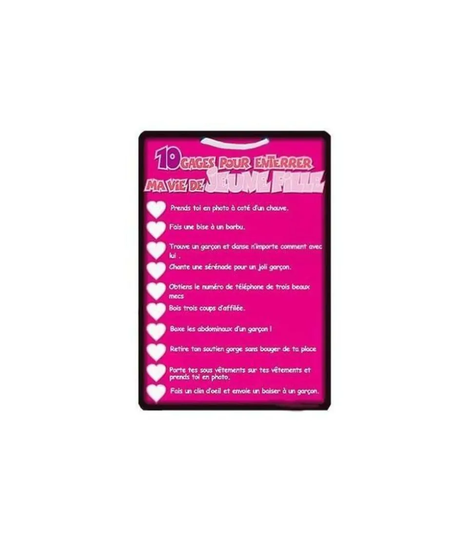 Qu’est-ce qu’on va bien pourvoir donner comme gage à la prochaine qui se marie ? Si vous êtes à court d’idées pour l’enterrement de vie de jeune de fille de votre meilleure copine, alors cette carte gage vous aidera à lui faire passer un bon moment… Contient une cordelette pour porter autour du cou. Fiche cartonnée avec 10 gages. Dimensions : 16 x 11 cm