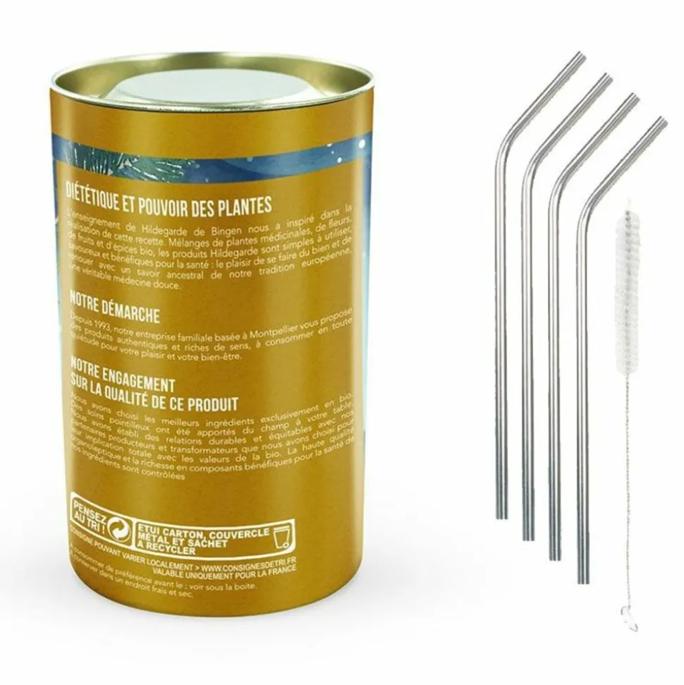 Cette bonne étoile vous guide et vous protège. Le gingembre, la coriandre, la réglisse et la cardamome, contribuent au maintien des défenses de l’organisme et soutiennent le système immunitaire. Ces plantes permettent de lutter contre les refroidissements. Ingrédients : gingembre*(30%), cannelle*, fenouil*, coriandre*(10%), zeste d’orane*, réglisse* (8%), galanga*, cardamome* (3%), romarin*, muscade*, anis*. Boite de 100 g net . Les 4 pailles en acier inoxidable de 21 cm sont nettoyables facilement grâce à un goupillon de nettoyage avec une petite brosse. Elles permettent de préserver la nature et de ne pas jeter d’accessoires en papier ou en plastique.