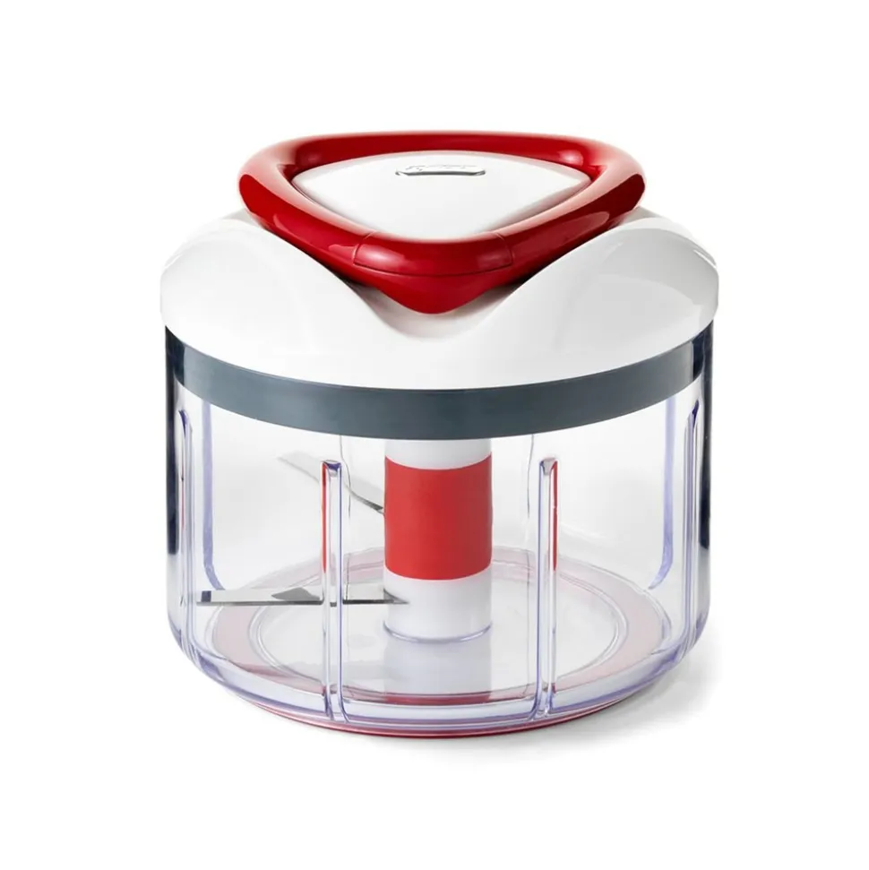 Le multi-hachoir Easy Pull Zyliss ZE910015 est un mixeur manuel doté d’un design breveté vous permettant de hacher vos ingrédients en toute simplicité et de façon uniforme. Cet ustensile deviendra vite indispensable pour hacher, mélanger et réduire en purée tous vos ingrédients en toute simplicité et sans avoir à brancher quoi que ce soit. Plus qu’un simple ustensile de cuisine, le multi-hachoir peut être utilisé pour préparer cheesecake, salsa, smoothies, cocktails, salades, glaces, viandes hachées, chapelure et soupes. Tirez entre 3 et 5 fois sur la poignée pour un hachage grossier et entre 8 et 10 fois pour un hachage plus fin. Les deux lames en plastique agissent comme un mécanisme de nettoyage en détachant les aliments des parois et en les faisant retomber dans la zone de découpe.Hachoir compact et polyvalent pour couper, hacher, mélanger des légumes, fruits, nois, herbes, pour faires des pestos, salsas ou marinades. Patentiertes Schweizer Klingensystem. Système de lames rotatives breveté Suisse. Système à corde avec retour automatique pour actionner les lames – le plus de rotations, le plus fins les résultats. Grand bol de 0.75l er des pieds anti-dérapants pour uen grande stabilité.